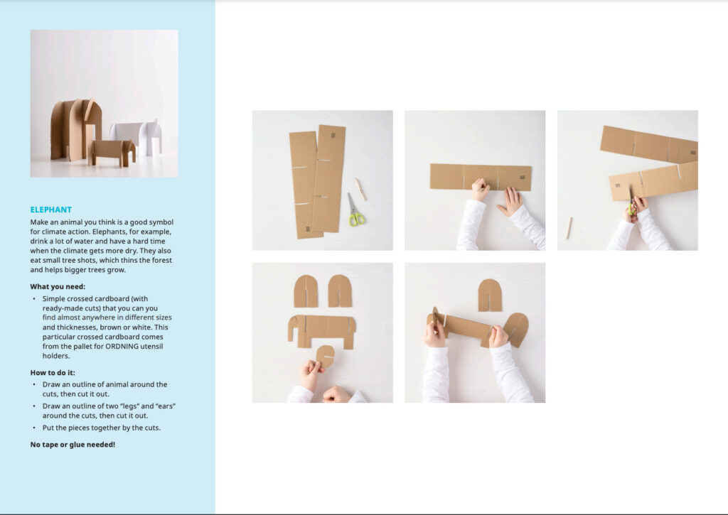 Instead of discarding cardboard and other packaging waste, families follow IKEA’s detailed instructions to craft charming cardboard toys, while discussing climate change. IKEA also encourages parents to ask their children to do some magical thinking during the creative process: “What would they like their symbol to tell their parents, teachers, politicians?”.