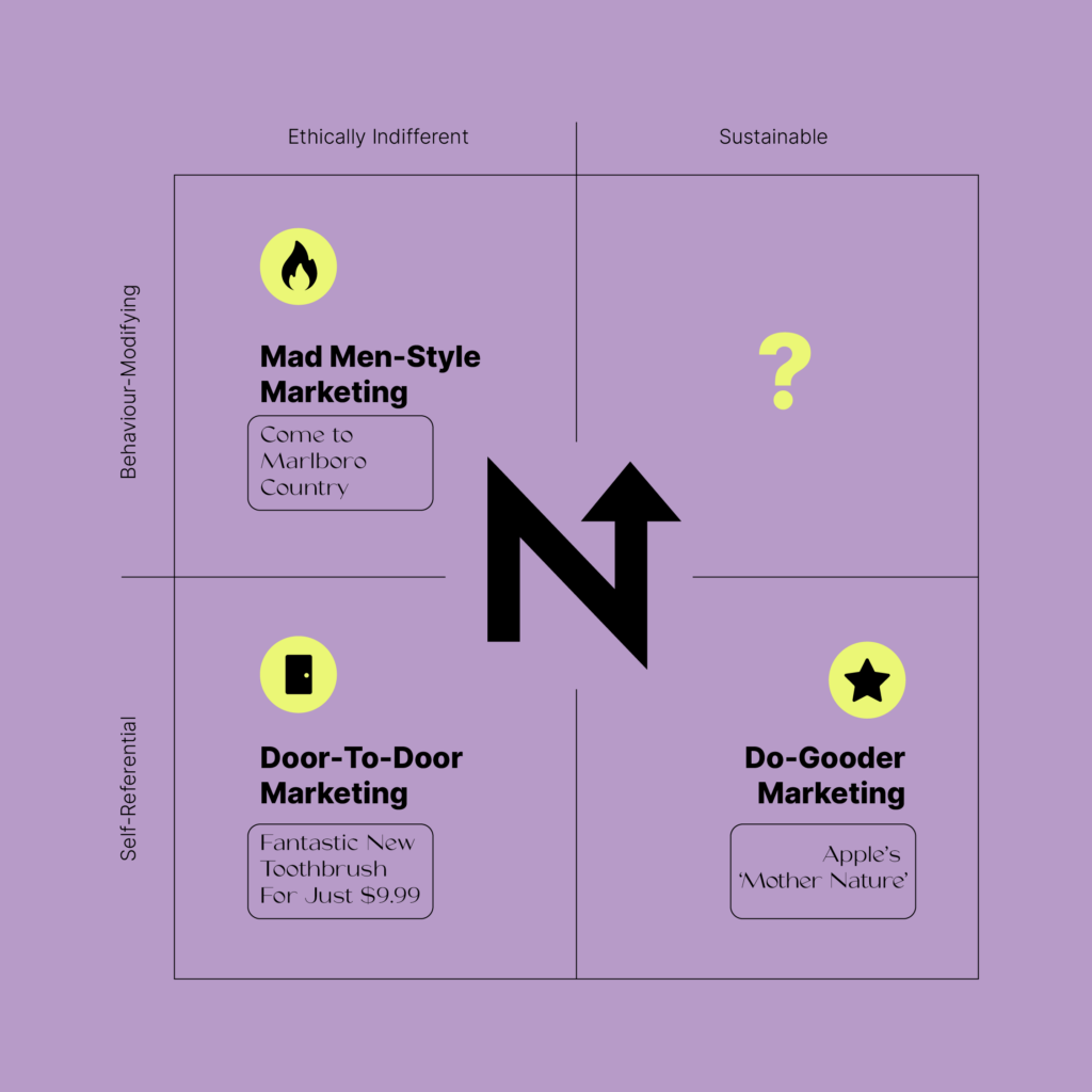 By seeking a clean break from the morally questionable content of mad-men style marketing, do-gooder marketing also gives up the ambition to deeply impact consumer behavior. Instead, it retreats to the self-referential stage of marketing: just like a door-to-door salesman would tirelessly list the “remarkable features of this new fantastic toothbrush”, do-gooder marketing is reduced to the role of itemizing the company’s good deeds (eliminating plastic, shifting to clean electricity, reducing carbon emissions, etc.).