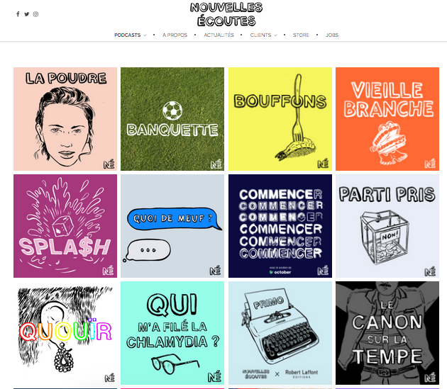 The visual identity is also 100% aligned with the podcast studio Nouvelles Écoutes’ brand architectureBrand architecture defines the role of each brand and acts as a guideline for the interrelationship between the brands in your organization. More: almost all podcasts from this studio share a similar visual identity (same font + illustrations on a colored background). This is a very smart decision as it allows the audience to easily recognize other podcasts produced by the studio and communicate a professional image to the public.