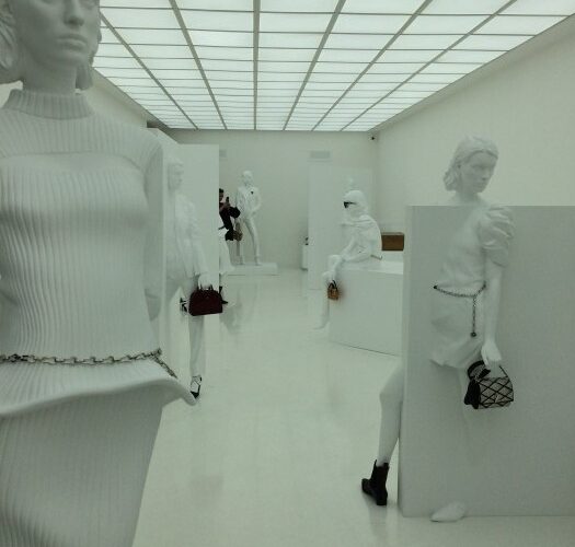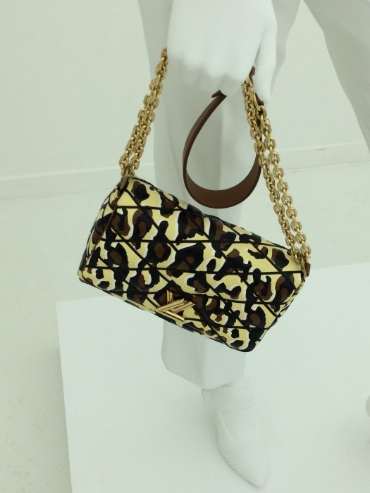 Every room was a wonder. One boasted wall-to-wall video, another showed the whole catwalk collection on several enormous screens. The space designed to showcase accessories was so intensely, eye-cachingly bright that I was forced to don sunglasses (if Anna Wintour can do it, so can I). Statues emerged from the light, clutching stunning trunks and glittering chain belts. Another room focused more on the tangible, tantalisingly allowing its audience to imagine what owning an LV wardrobe would be like. Purposefully interactive, you could stroke the beading, smell the leather, turn the clutch clasp and lick the shoes – if you wanted to. I didn’t lick the shoes.
