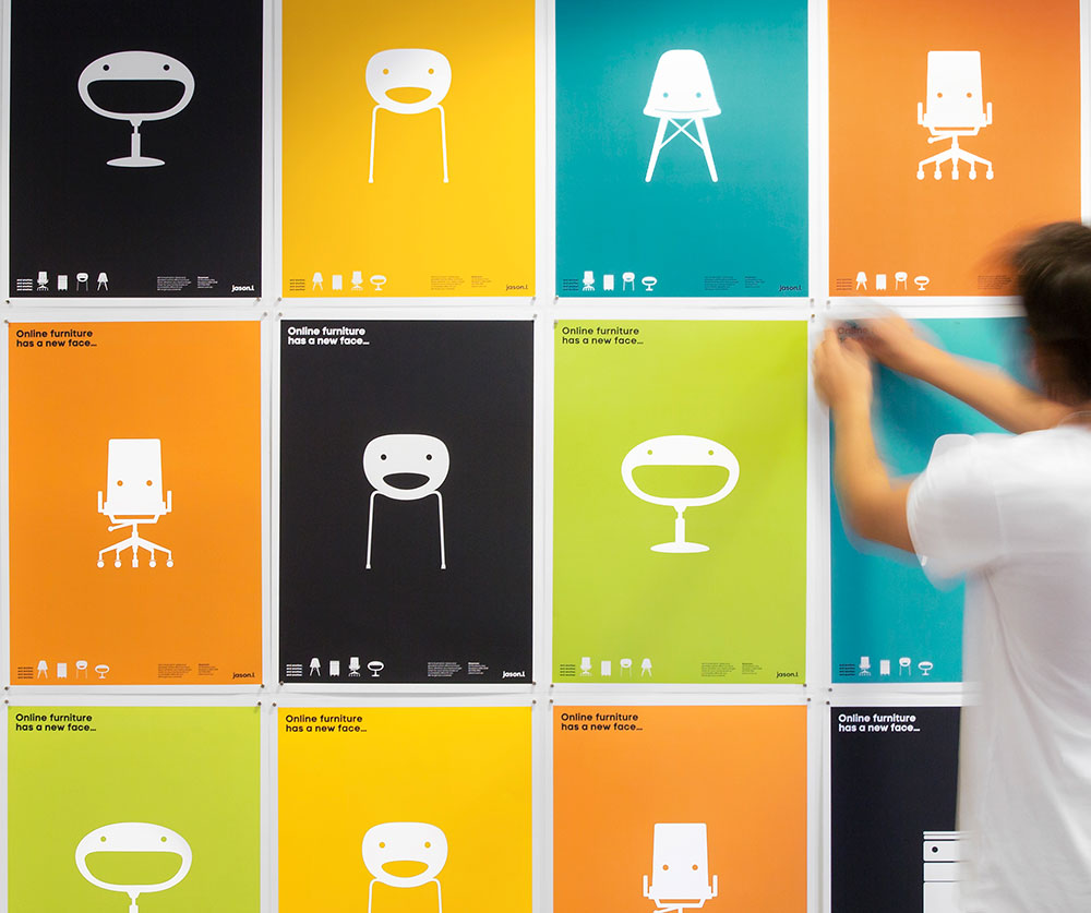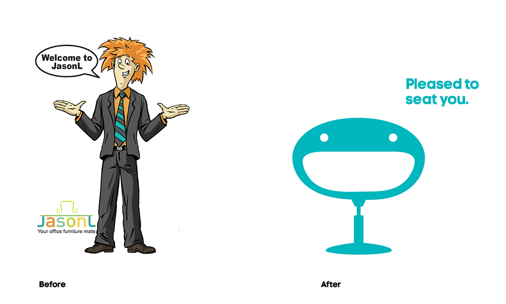The original brand visual representation reflected the brand’s personality but didn’t mirror the established brand Jason.l has become. For instance, the original mascot was not perceived as very professional. The agency therefore replaced it with a series of modern office furniture characters with a friendly and fun attitude. “These form the basis of an identity system that not only reflects what Jason.l sells, but the way they do business – a little out of the ordinary.” (cited in Rebrand).