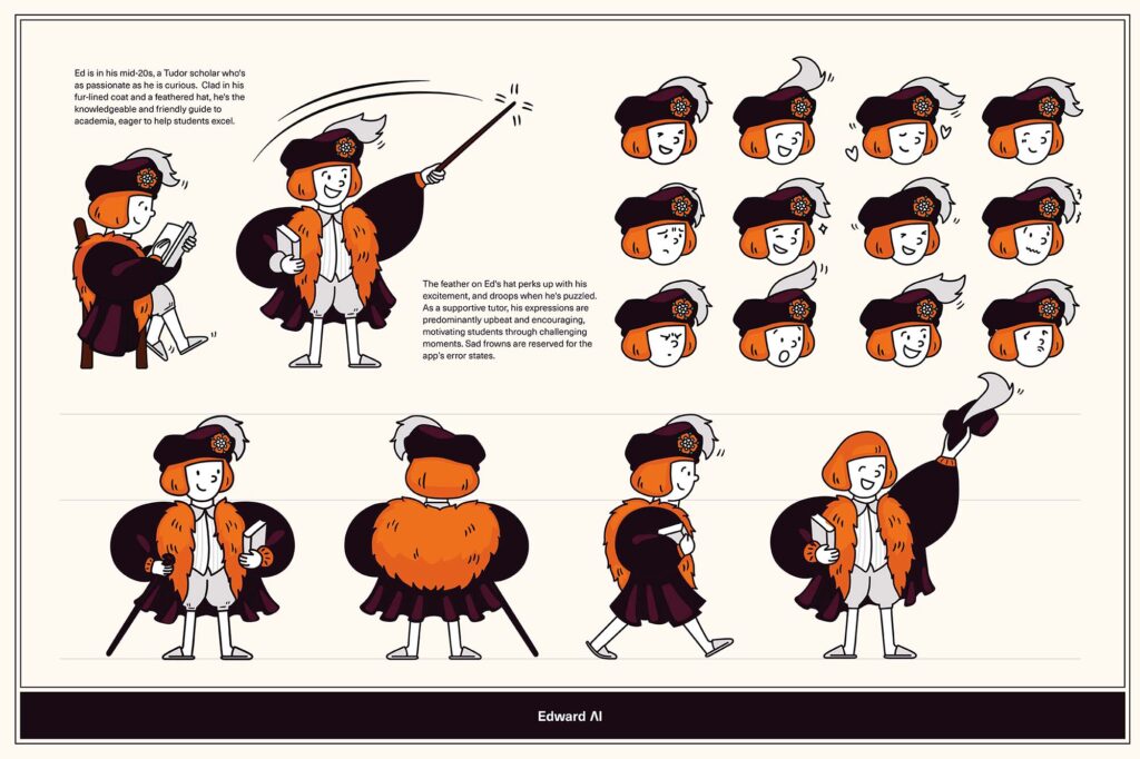 The design process was deeply iterative, with constant revisits to earlier stages to ensure brand coherence. Starting with the mascot design, I drew inspiration from Edward VI, blending traditional Tudor-era scholar attire with modern sensibilities. The mascot’s silhouette was crucial, so I chose a fur-lined scholar’s coat and a feathered hat to add to Ed’s character.
