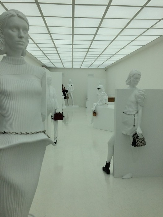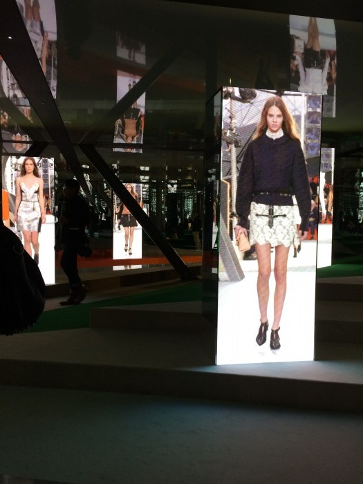Every room was a wonder. One boasted wall-to-wall video, another showed the whole catwalk collection on several enormous screens. The space designed to showcase accessories was so intensely, eye-cachingly bright that I was forced to don sunglasses (if Anna Wintour can do it, so can I). Statues emerged from the light, clutching stunning trunks and glittering chain belts. Another room focused more on the tangible, tantalisingly allowing its audience to imagine what owning an LV wardrobe would be like. Purposefully interactive, you could stroke the beading, smell the leather, turn the clutch clasp and lick the shoes – if you wanted to. I didn’t lick the shoes.